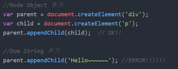 appendChild()는 오직 Node Object만 추가 할 수 있다.