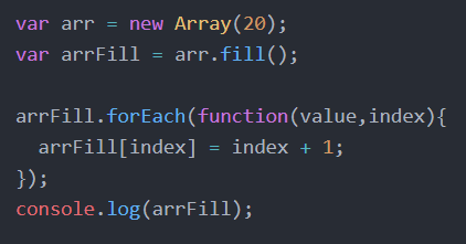 Array( )를 이용해 크기가 20인 배열을 만들어 주고, forEach문을 이용해 1 ~ 20의 값들을 배열에 넣어주었다.