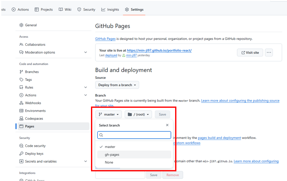 4. pages에서 gh-pages로 변경 후 save 하기