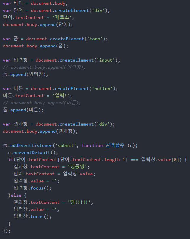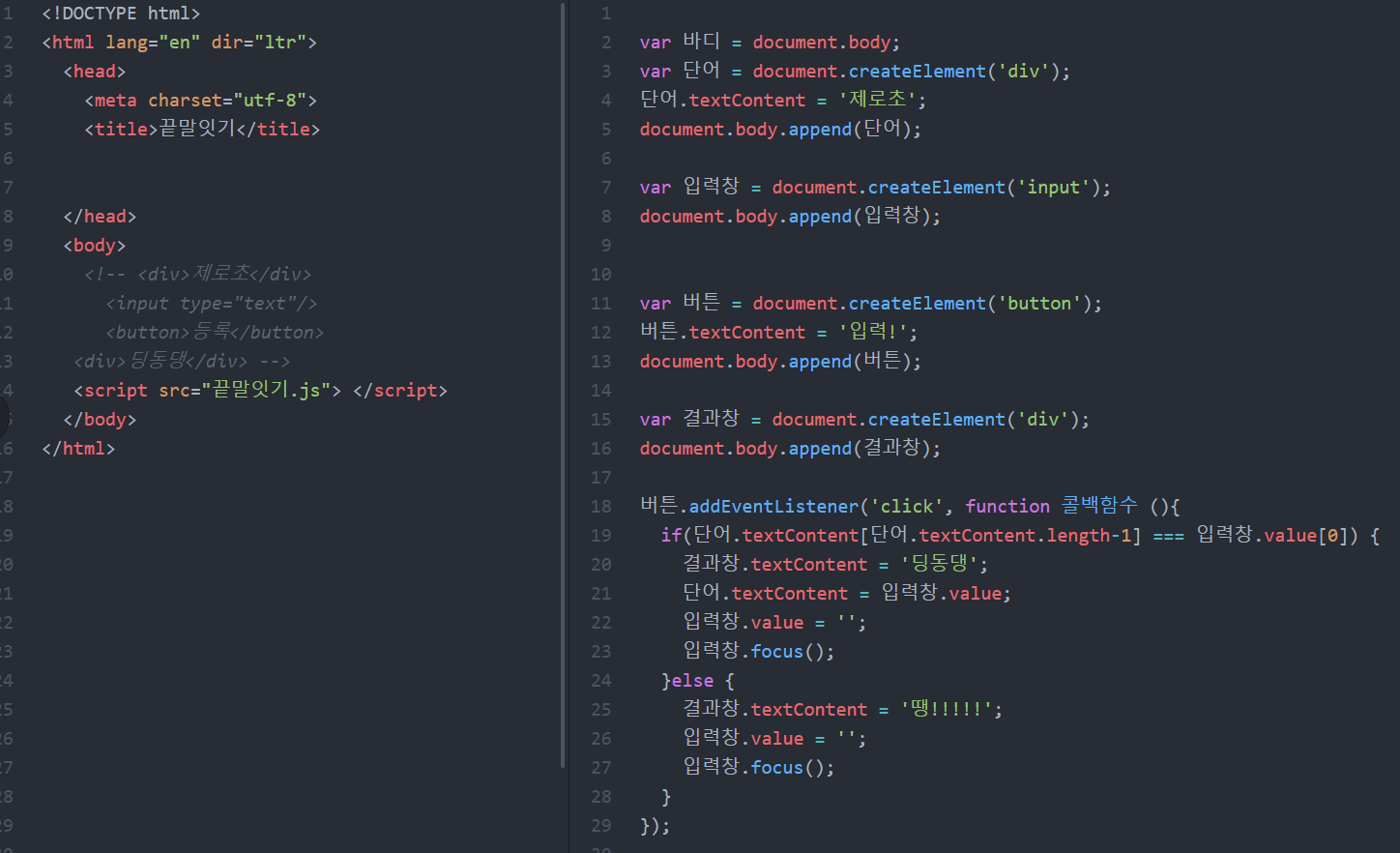이를 토대로 자바스크립트를 이용하여 끝말잇기를 구현하였다.