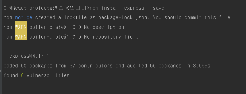 --save를 추가해주었기 때문에 package.json에 dependencies로 표시되어 express를 다운받았다는것을 알려준다.