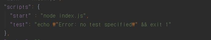 이제 실행을 해주기 위해서 script에 "start" : "node index.js" 라고 넣어주었다.