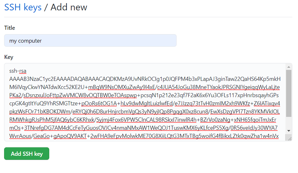 Title를 적고 아까 복사해둔 Key를 붙여넣기 해준다. 이제 SSH Key 추가해주면 끝!