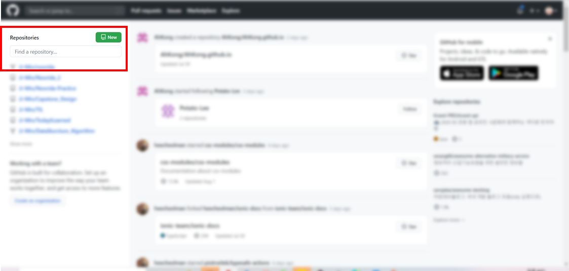 git에 로그인하면 repository를 생성할 수 가 있다. New 클릭하기.
