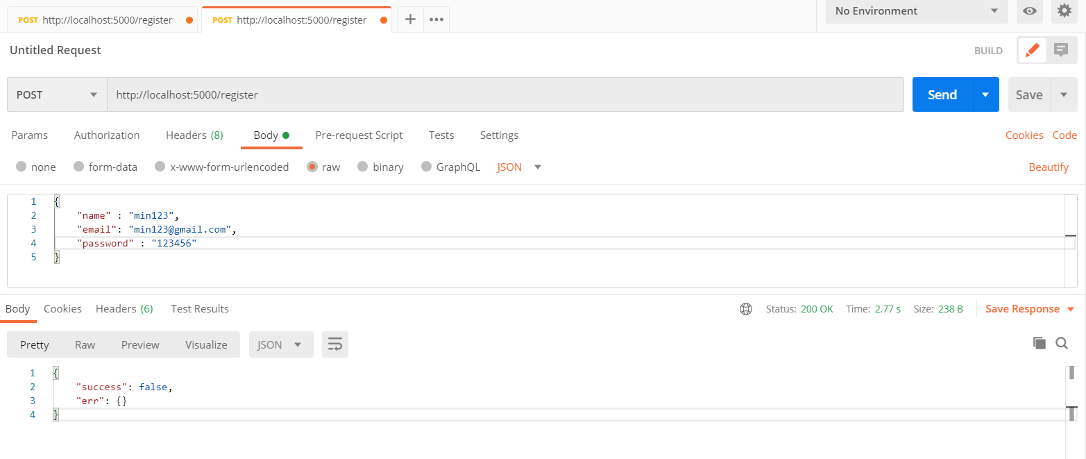 클라이언트에서 보내준 데이터들을 req.body로 받아 회원가입을 해줄수 있게 라우터를 만들었다.