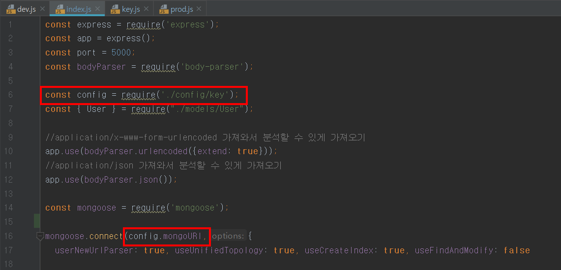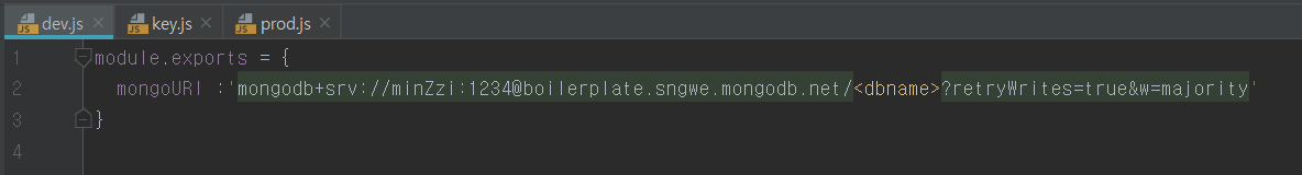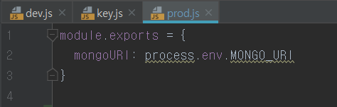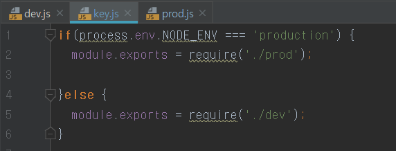 key.js는 환경 변수 process.env.NODE_ENV을 이용해 내가 개발 모드인지 배포후인지를 구분해 맞는 환경에 따라 URI를 가져 올 수 있도록 한다.