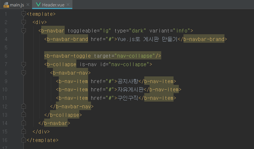 맨 앞에 있는 b-navbar에 있는 toggleable로 정한다! 지금은 lg로 설정해있다.