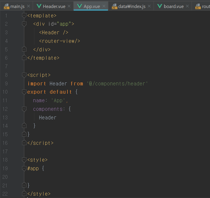 그러므로 header는 라우터로 해주는것이 아니라 App.vue 부분에다 component를 등록해준다!