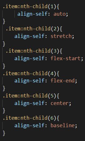 align-self : auto; ( 기본값 ) align-items 설정을 상속 받음