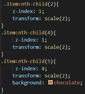 2번째 4번째 5번째의 아이템에 z-index값을 주었고 5번째는 숫자를 좀 더 크게 주었다.