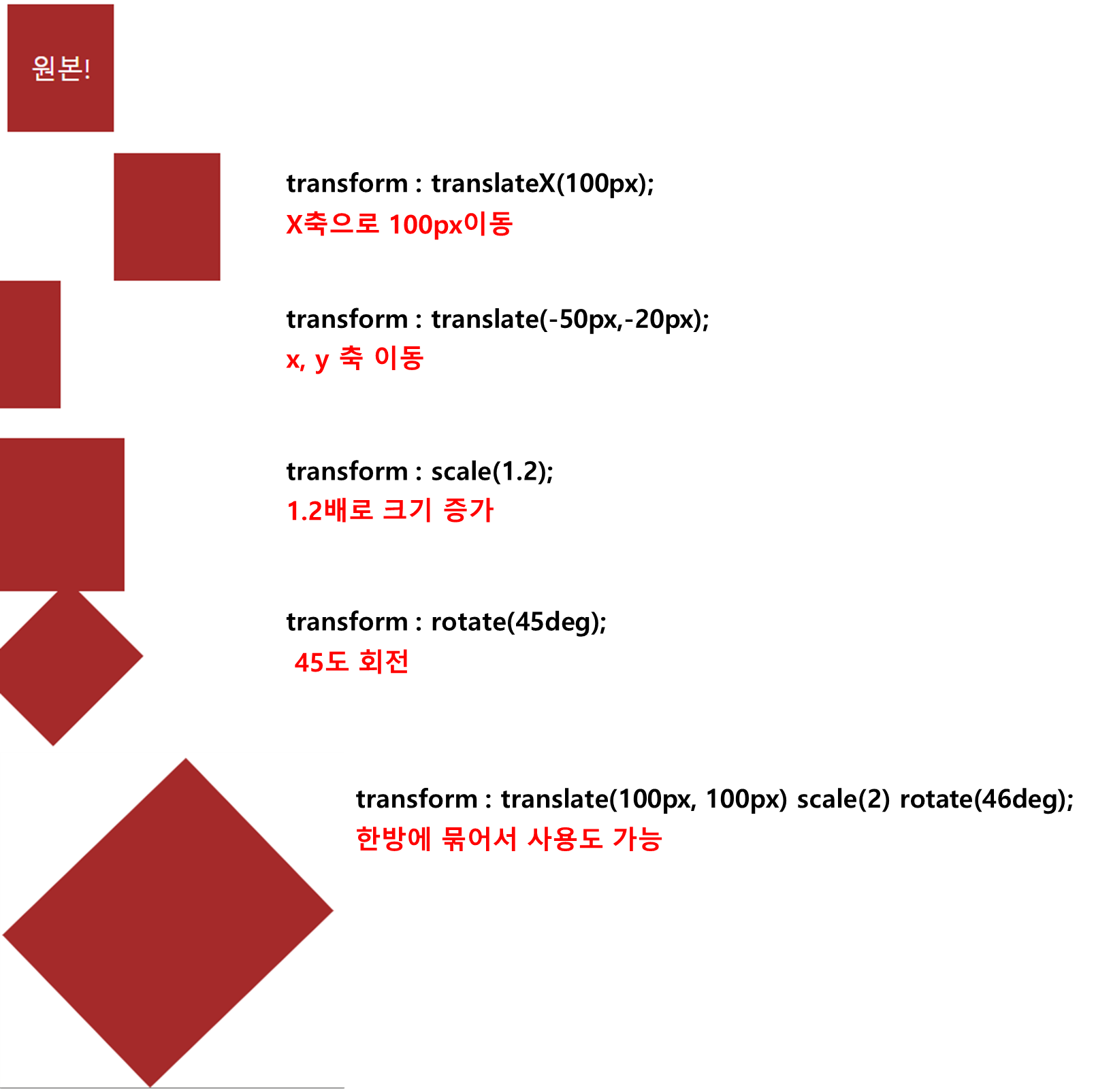 요소의 모양, 크기등을 조절하고 기울기, 이동효과를 줄 수 있다.