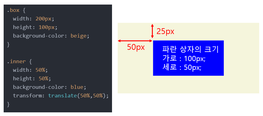 translate(50%,50%)는 가로 50px, 세로 25px만큼 이동하게 되어 가운데 정렬을 해줄 수 있다.
