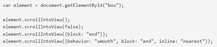 Element 인터페이스의 scrollIntoView() 메소드는 scrollIntoView()가 호출 된 요소가 사용자에게 표시되도록 요소의 상위 컨테이너를 스크롤합니다.